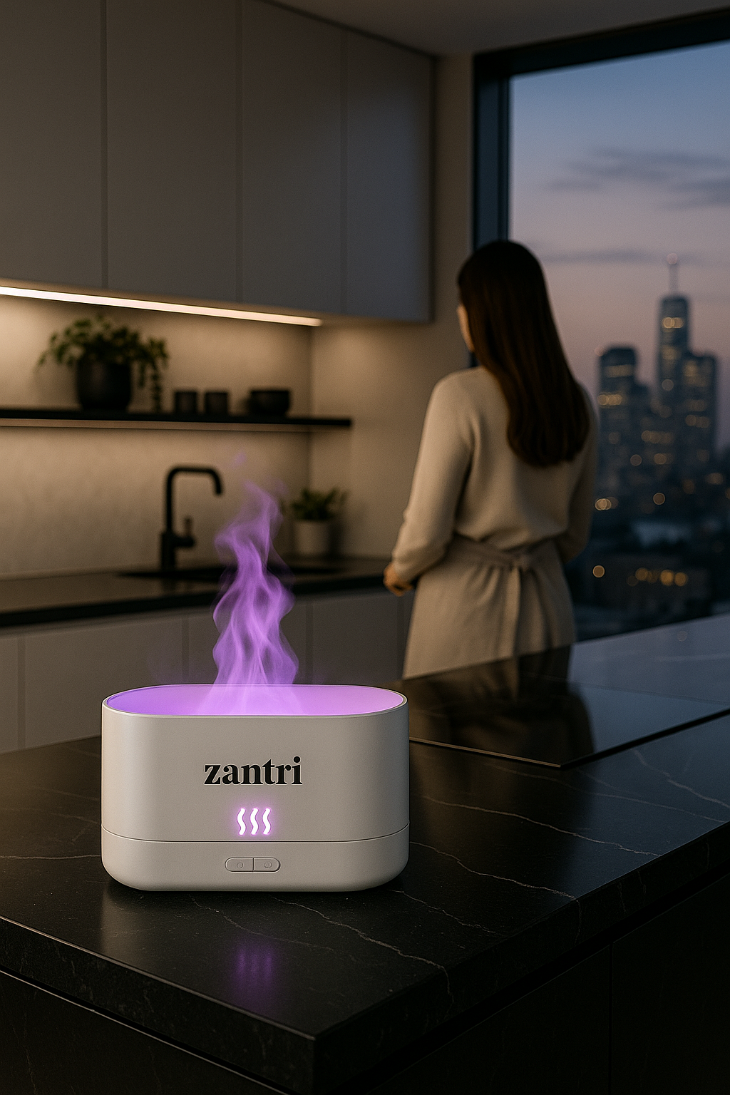 Turn your space into a calming escape — with the Zantri's flame-like glow , essential oils , and cool mist in one sleek diffuser.